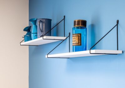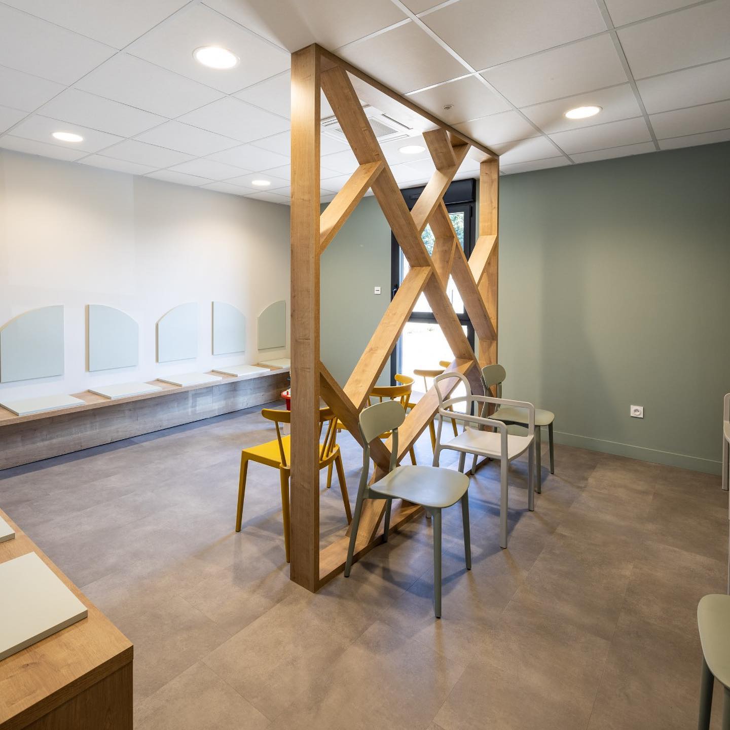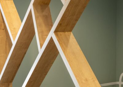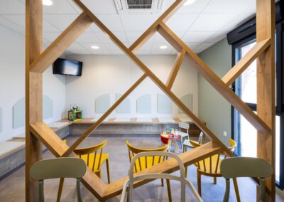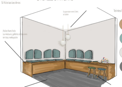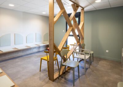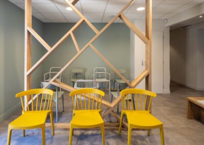 Côté meubles j’ai dessiné l’ensemble du mobilier et passé le relais à mes agenceurs/ menuisiers qui ont fait des merveilles en réalisant les claustras, la banque d’accueil, les bancs d’assise, bureaux et étagères…
