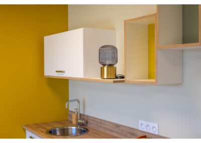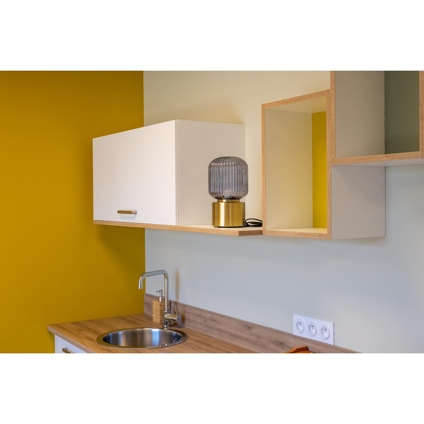 Assises peps et luminaires déco agrémentent l’ensemble pour un effet dynamisant qui contrebalance avec l’atmosphère cocon des différents espaces dont les couleurs sont neutres et apaisantes…