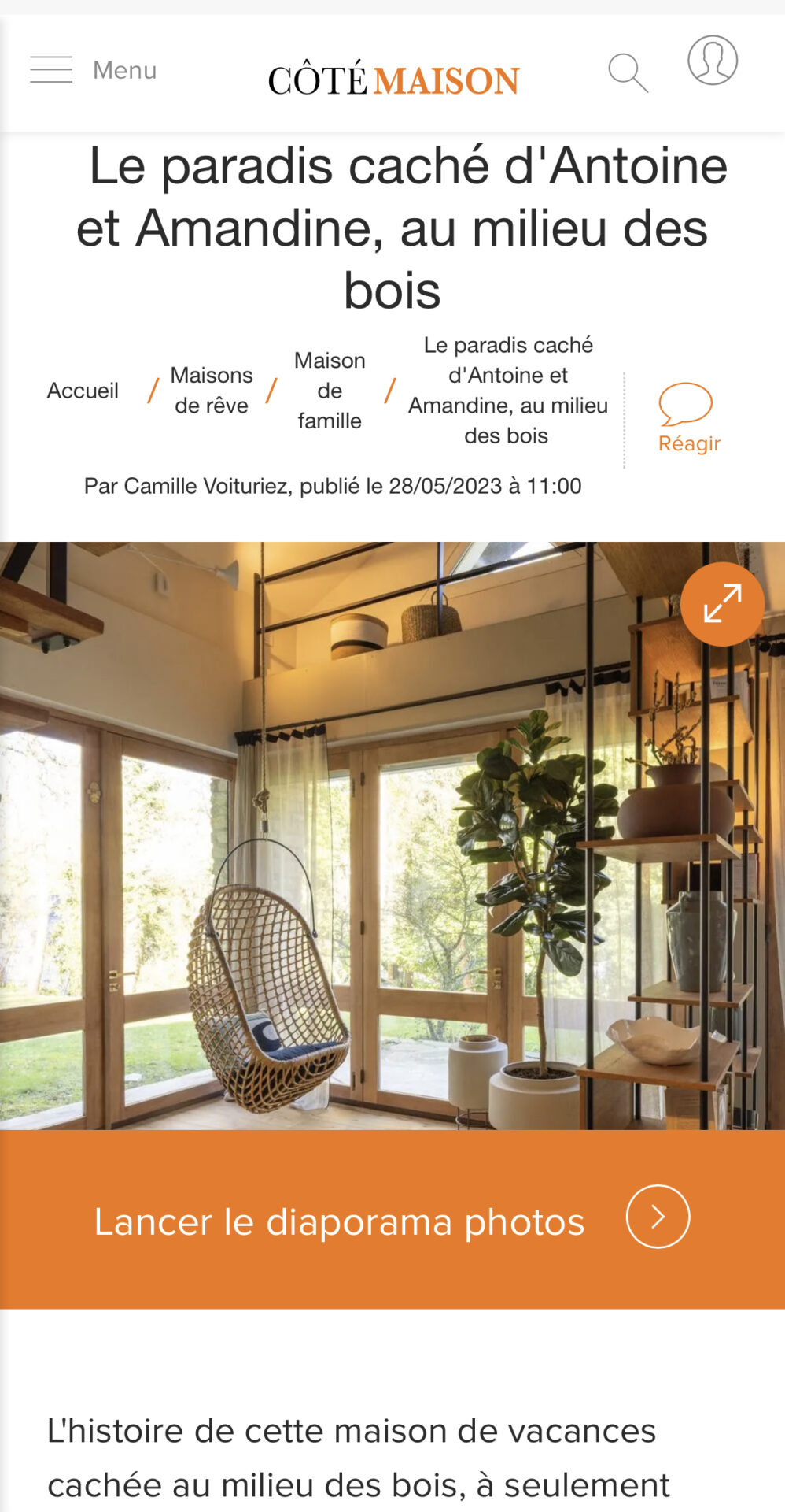 Retrouvez l’article complet sur le site Côté maison dont le lien se trouve ici: https://www.cotemaison.fr/maison-famille/diaporama/le-paradis-cache-d-antoine-et-amandine-au-milieu-des-bois_35695.html#