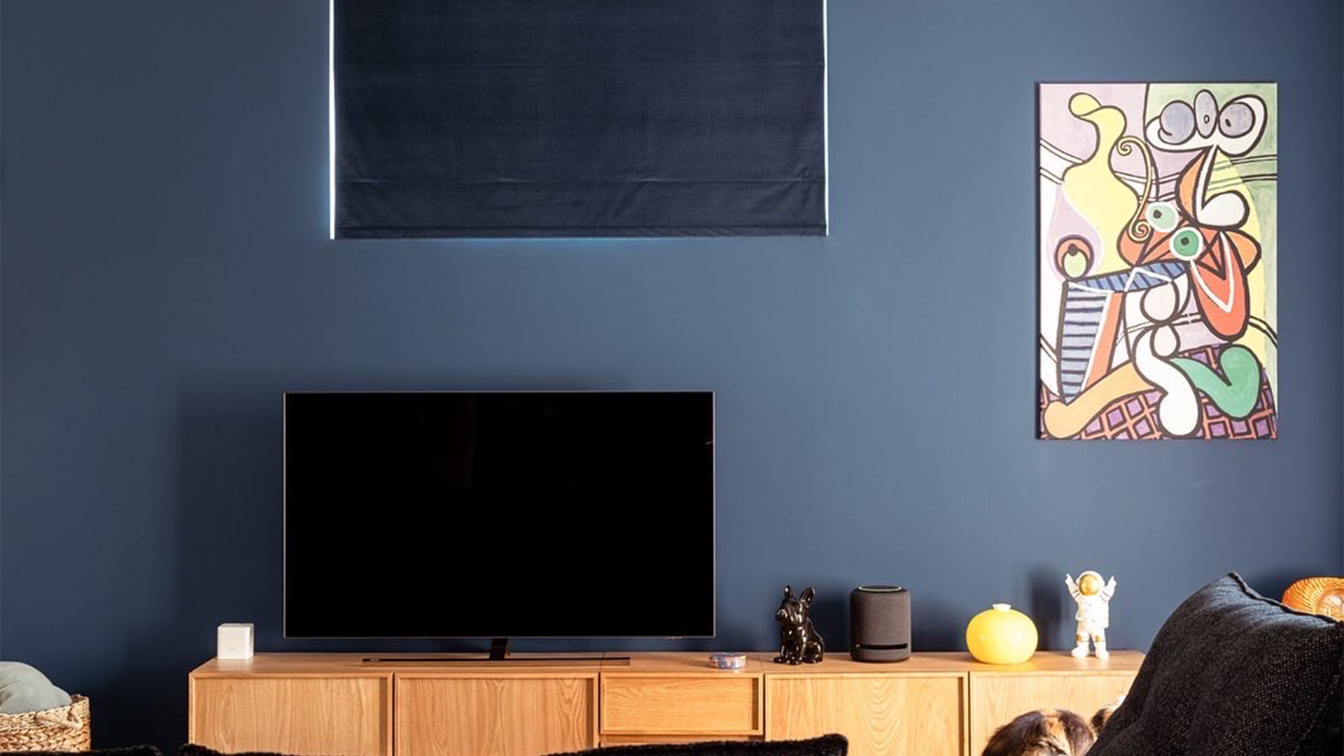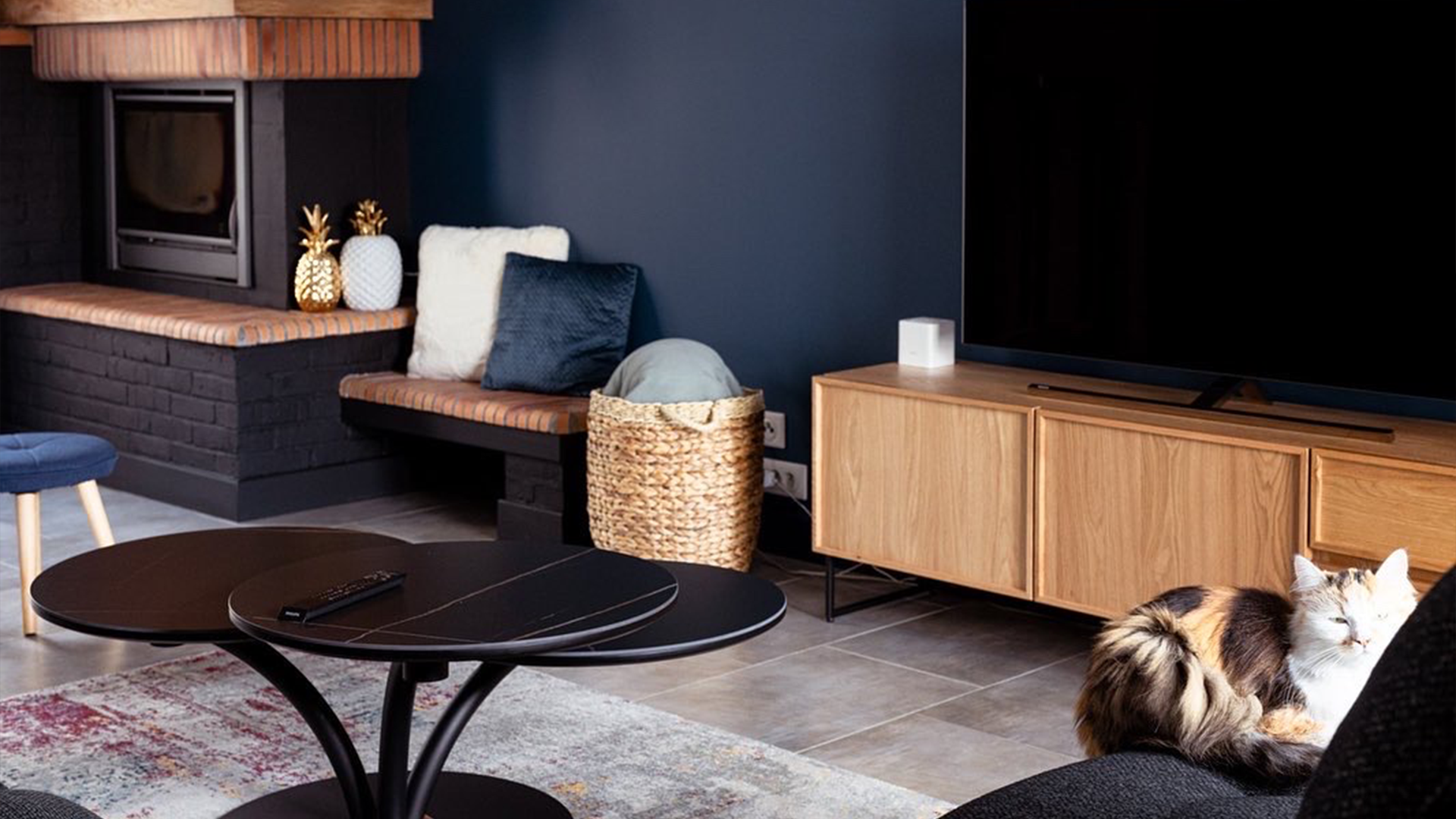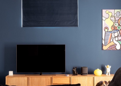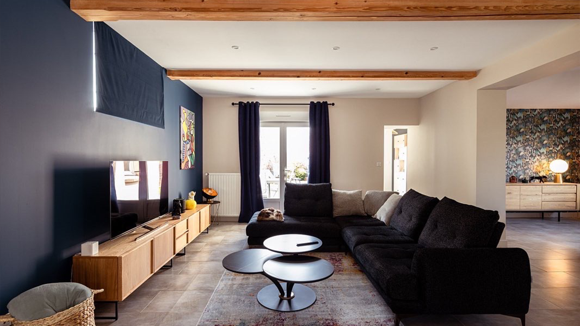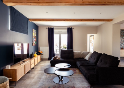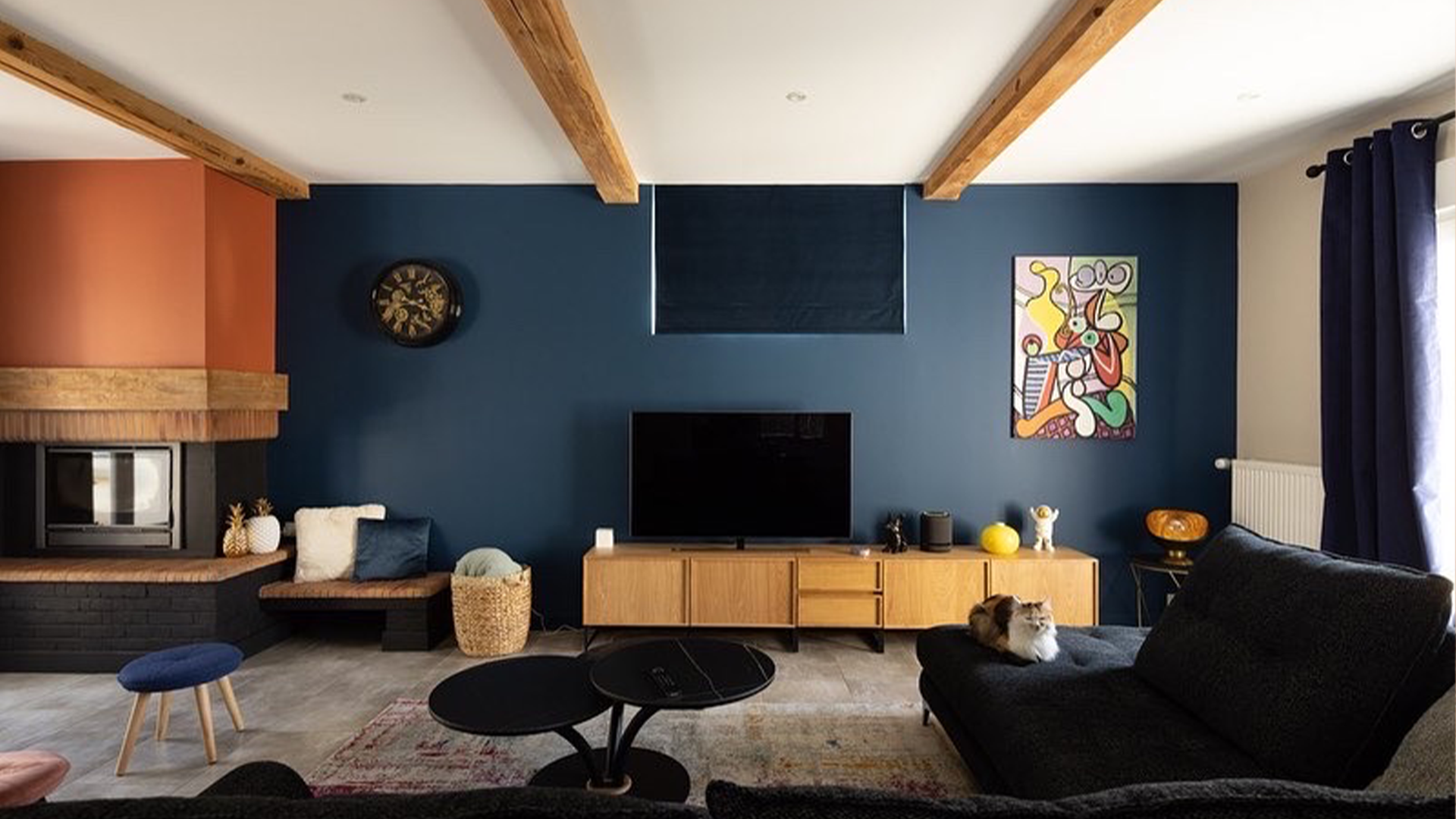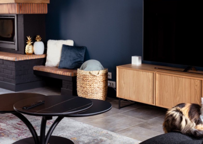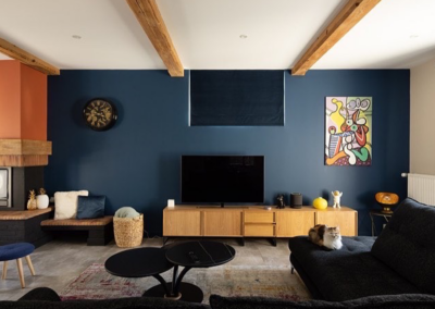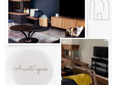 Nous avons travaillé une pièce à la fois, je vous montre ici le salon. Pour cette pièce mes clients avaient une envie particulière, Du bleu nuit! Et une touche de tarracotta pour le rappel avec la salle à manger. La cheminée à été relookée seulement avec de la peinture et la différence est remarquable. Du bois de chêne à été rajouté au niveau de l’espace TV pour réchauffer le bleu nuit du grand mur. L’ensemble du mobilier a été remplacé en bref tout est neuf dans cette pièce et le résultat est plutôt réussi. Mes clients s’y sentent bien pour mon plus grand bonheur.