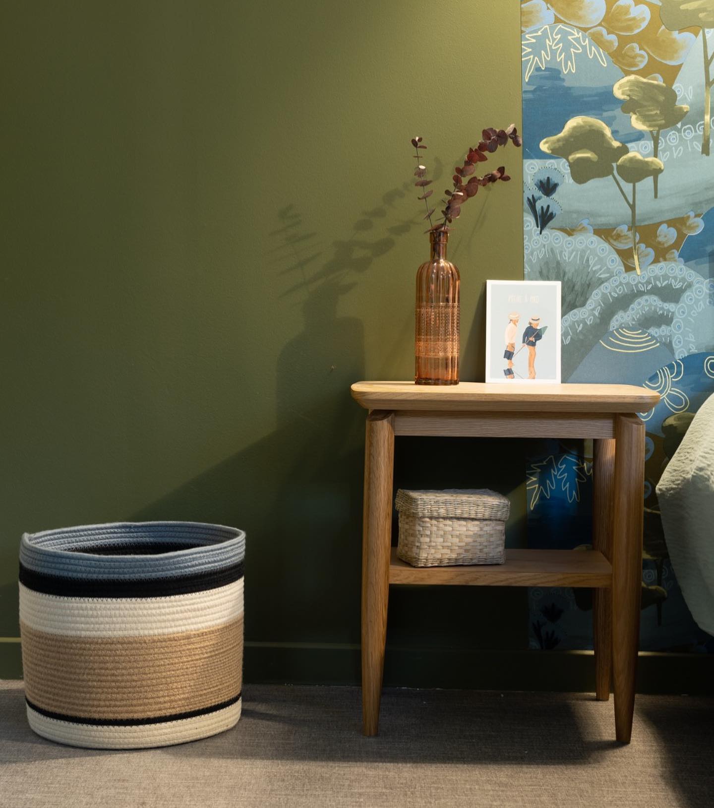 Du bois pour les chevets, le miroir et le banc TV puis des jolis textiles qui mêlent lin et gaze de coton.