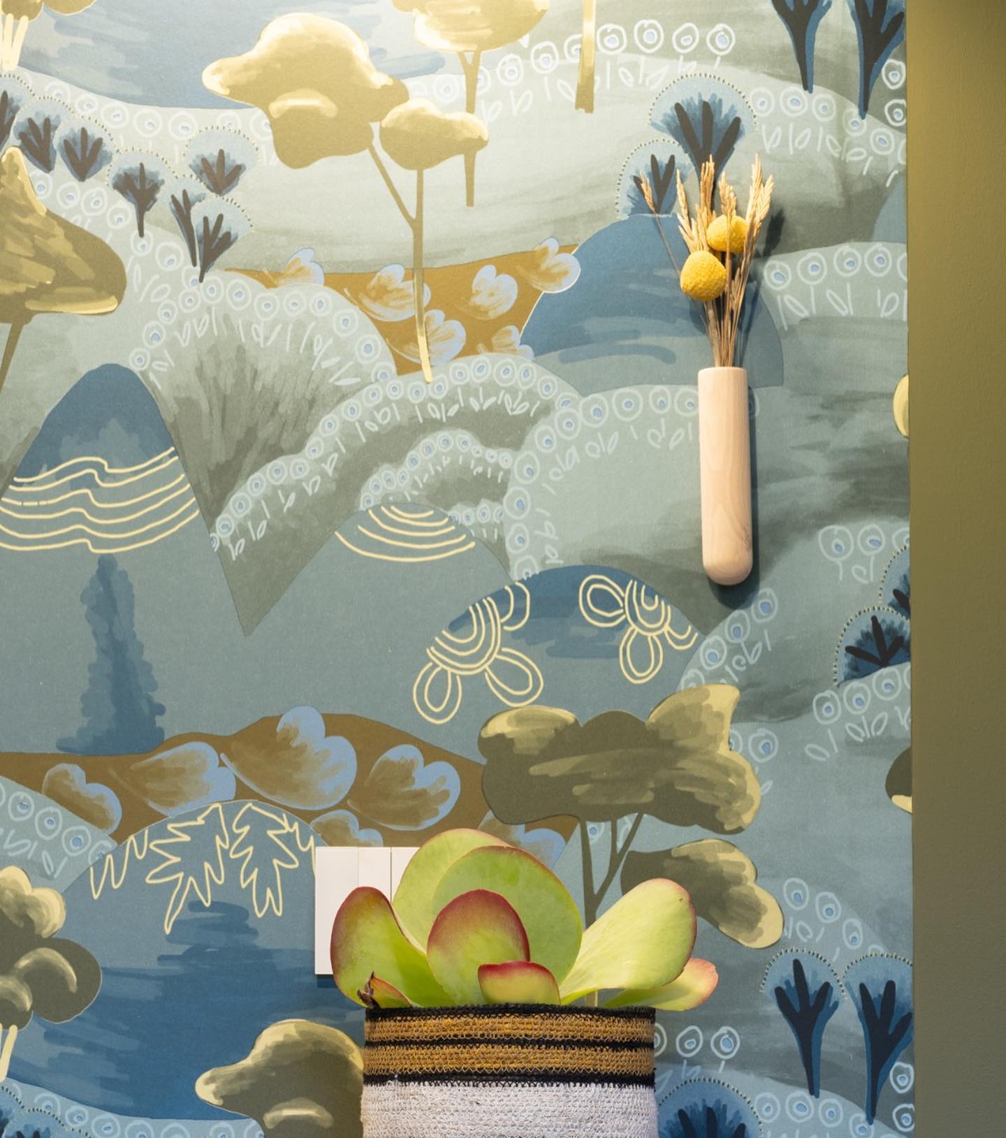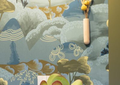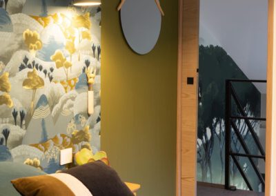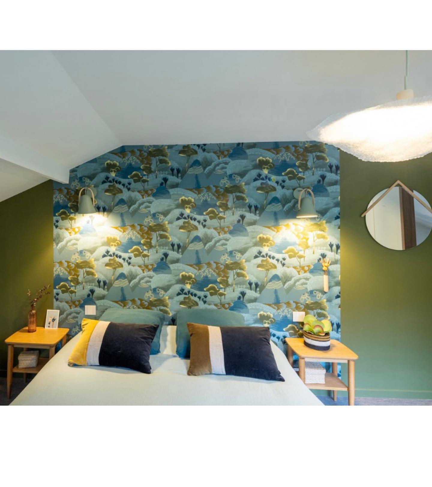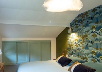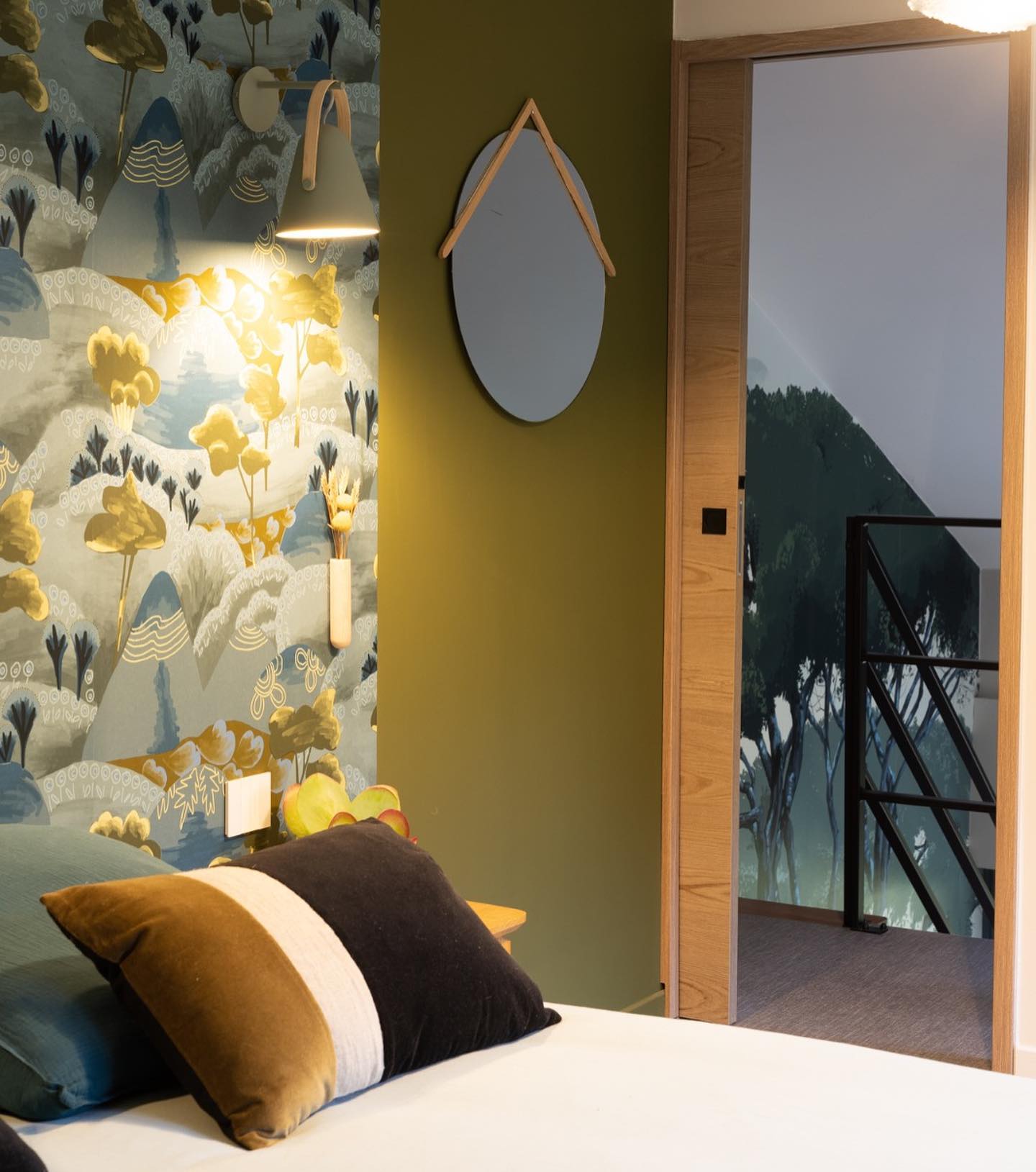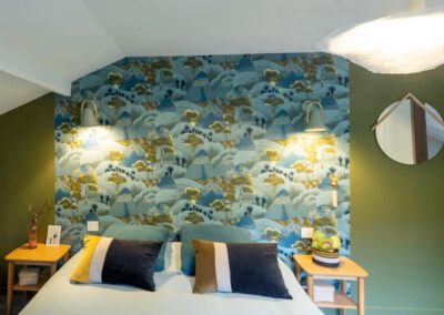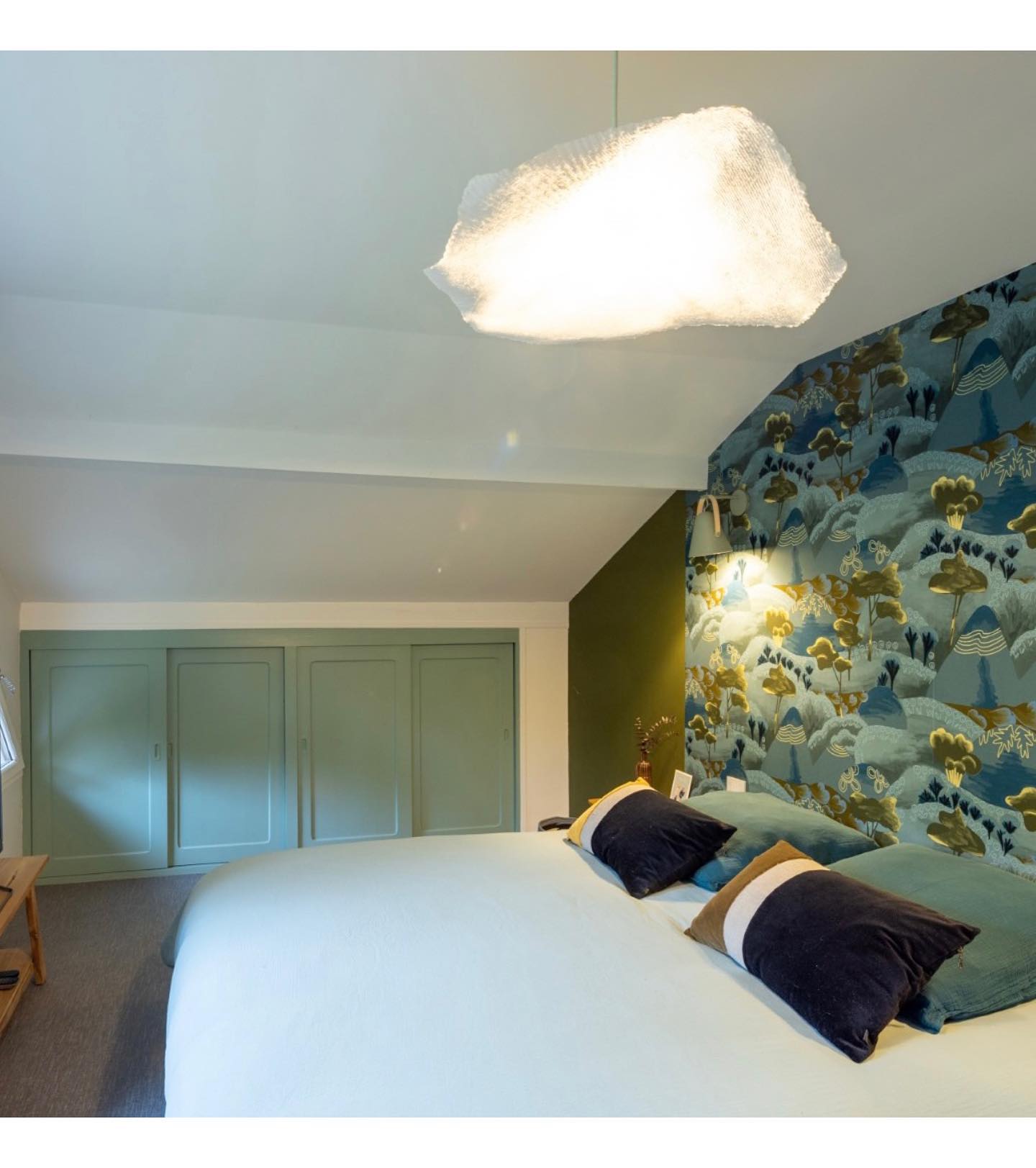 La salle d’eau a été retirée, pour l’ambiance nous sommes partis sur 2 nuances de vert, un kaki et un vert bleuté que l’on retrouve dans le papier peint de la tête de lit.