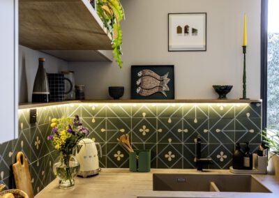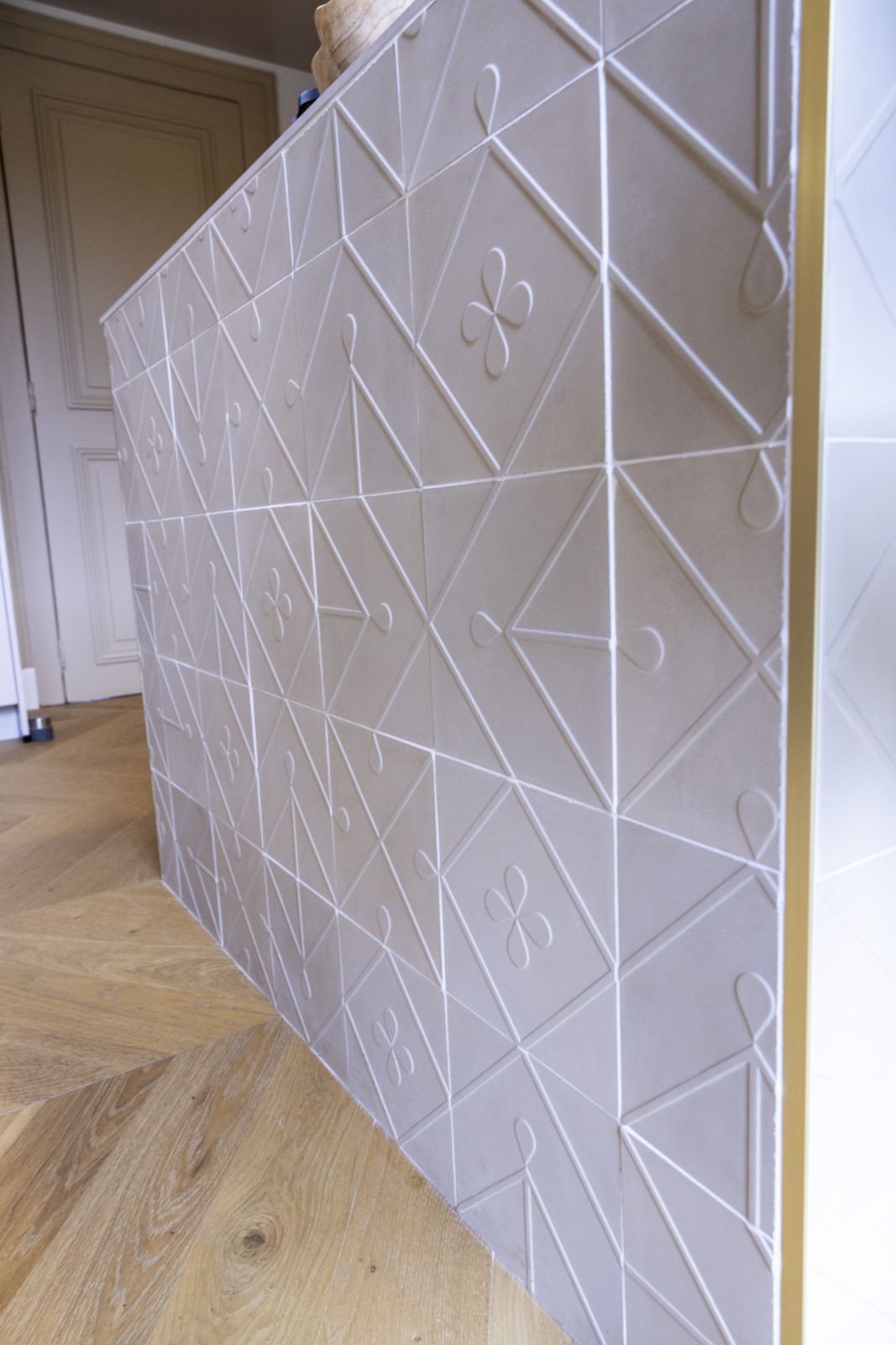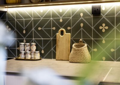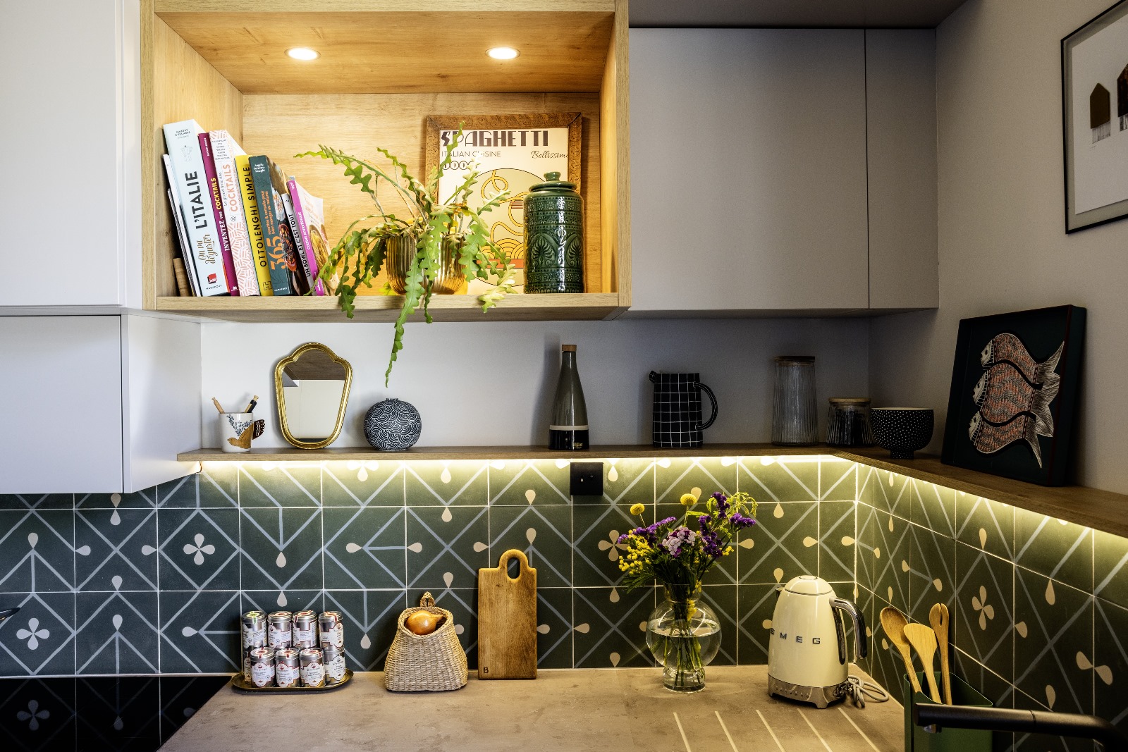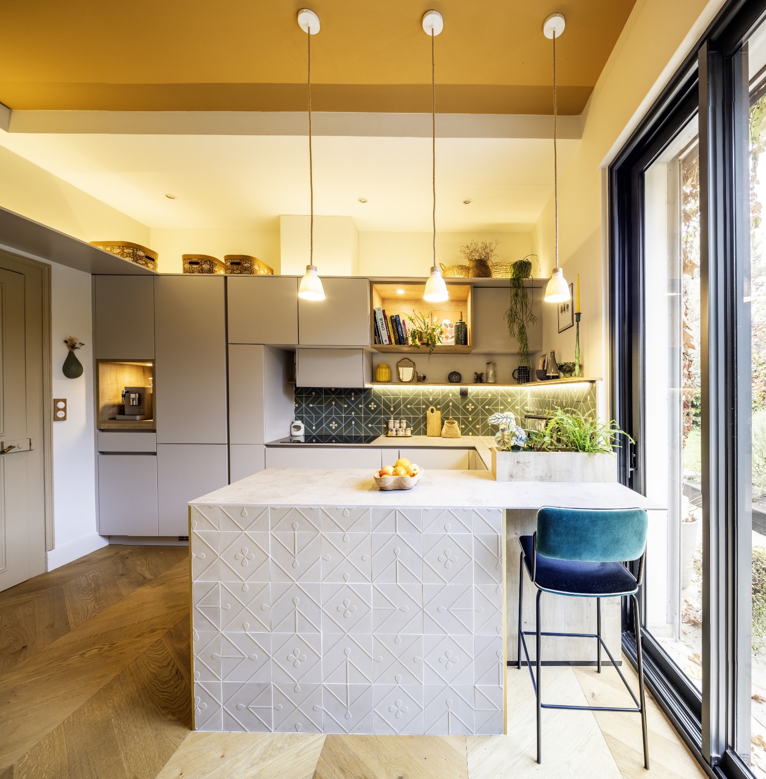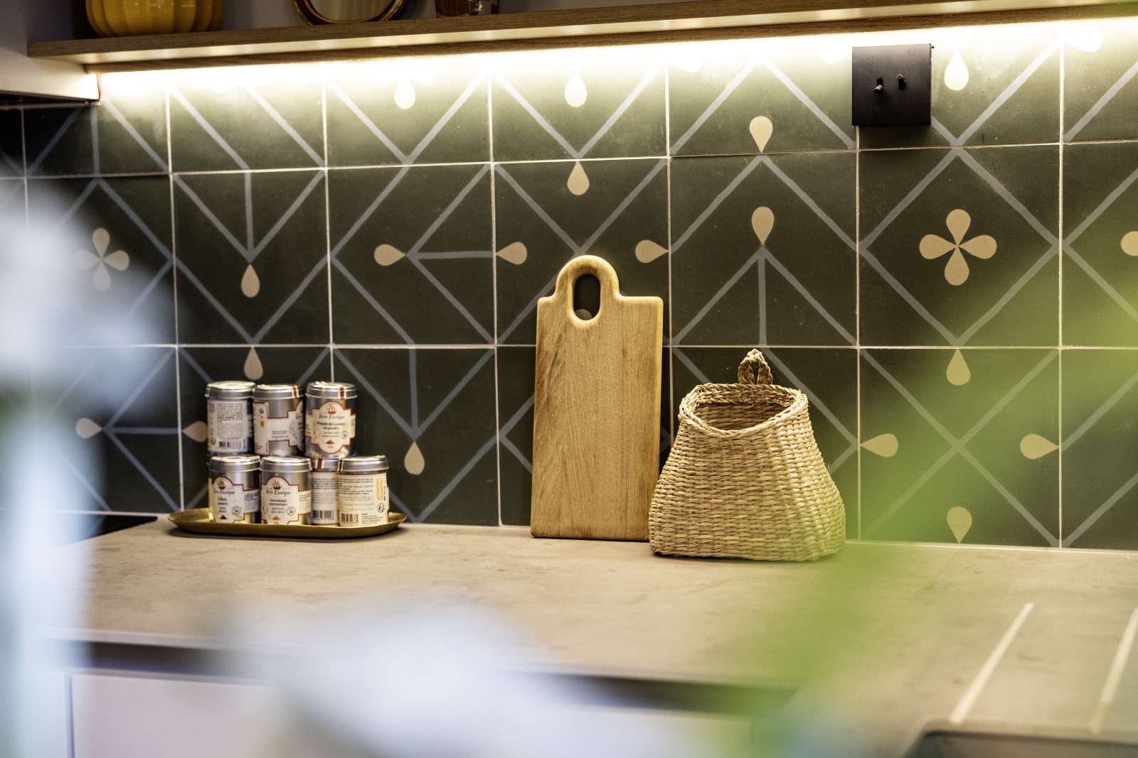 Les couleurs se sont déclinées naturellement suivant le choix du carreau de ciment en crédence, créé sur mesure (Maison bahya propose des motifs attrayants, modulables grâce à leurs nombreuses teintes et formes).