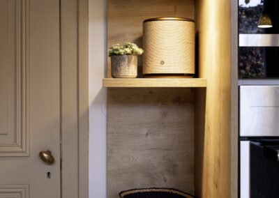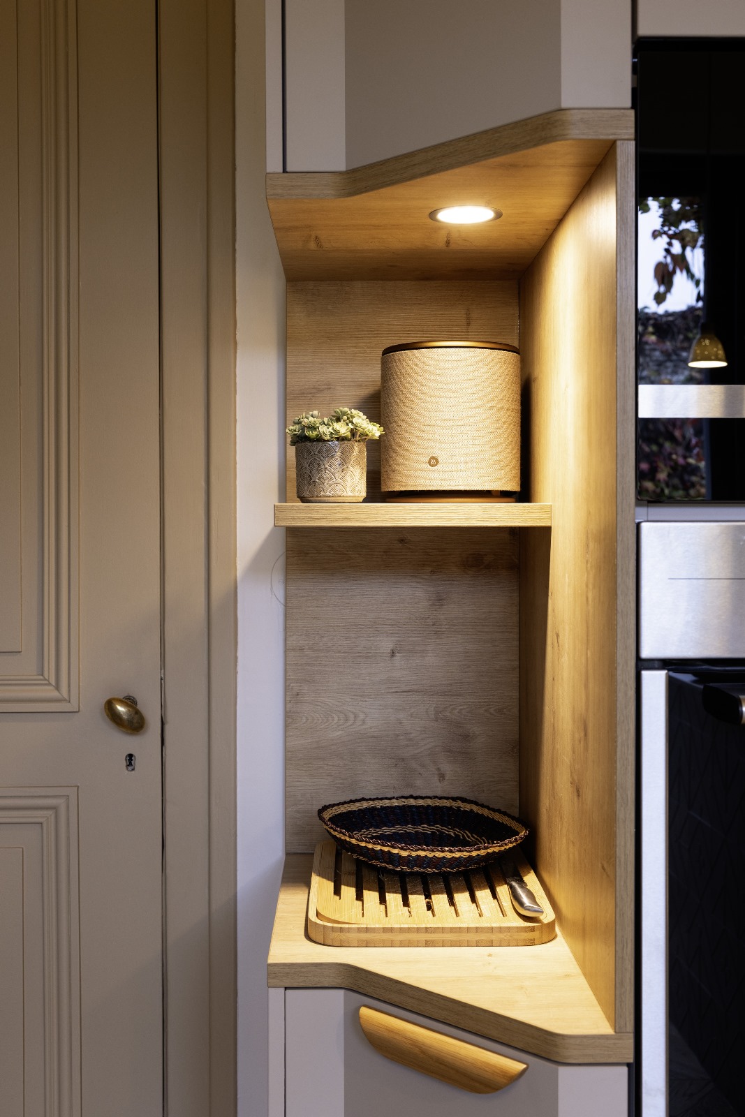 Une casquette a été créée pour rassembler les éléments en un seul bloc, tout en permettant d’ajouter de la déco, des tableaux, des paniers.