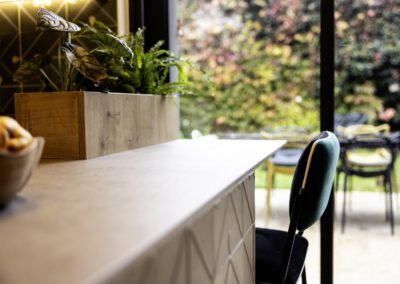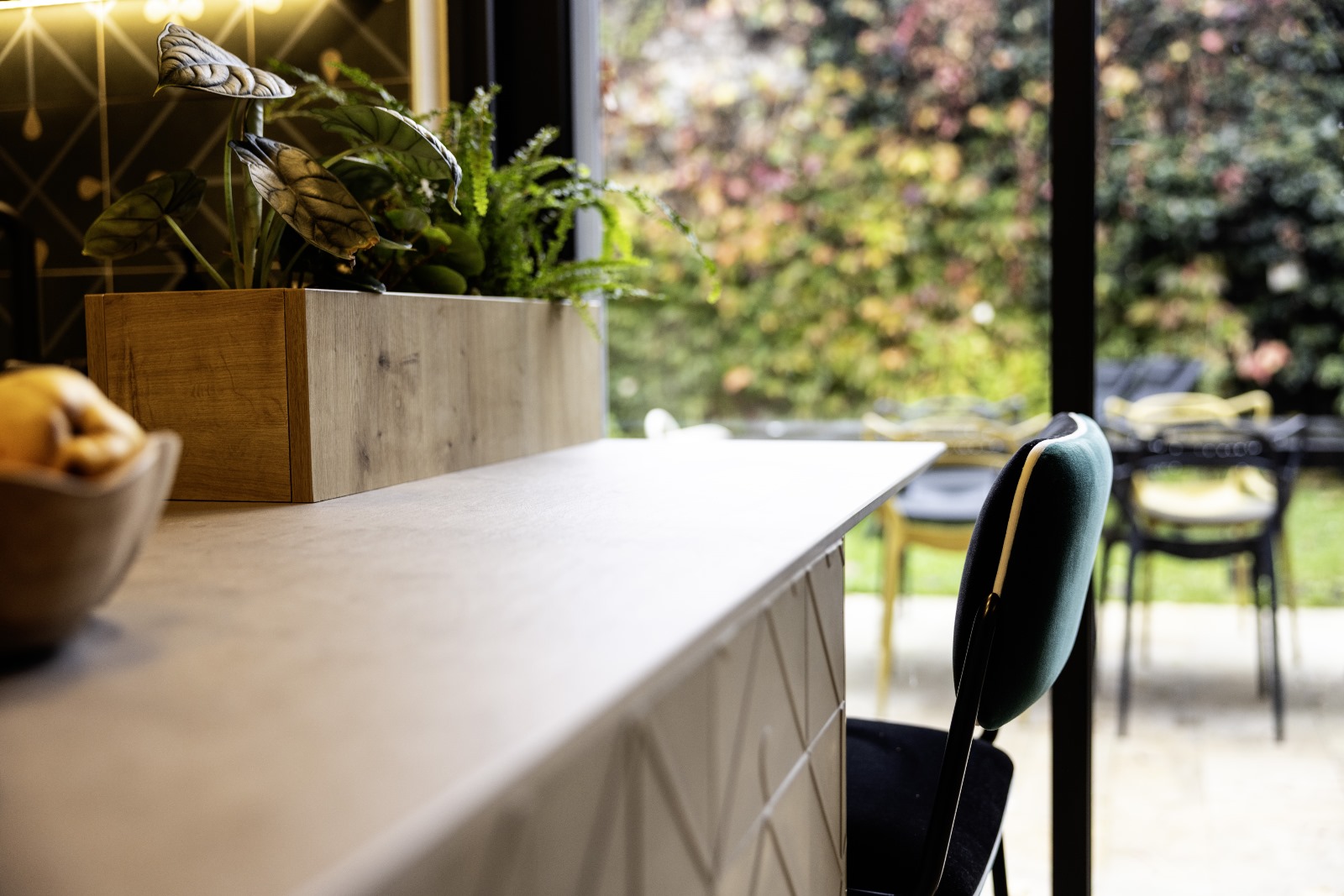Le plan cuisine a été doublé grâce à ce retour d’ilot qui permet de gagner en espace de travail mais aussi de se poser avec ce petit coin café prés de la baie.