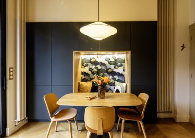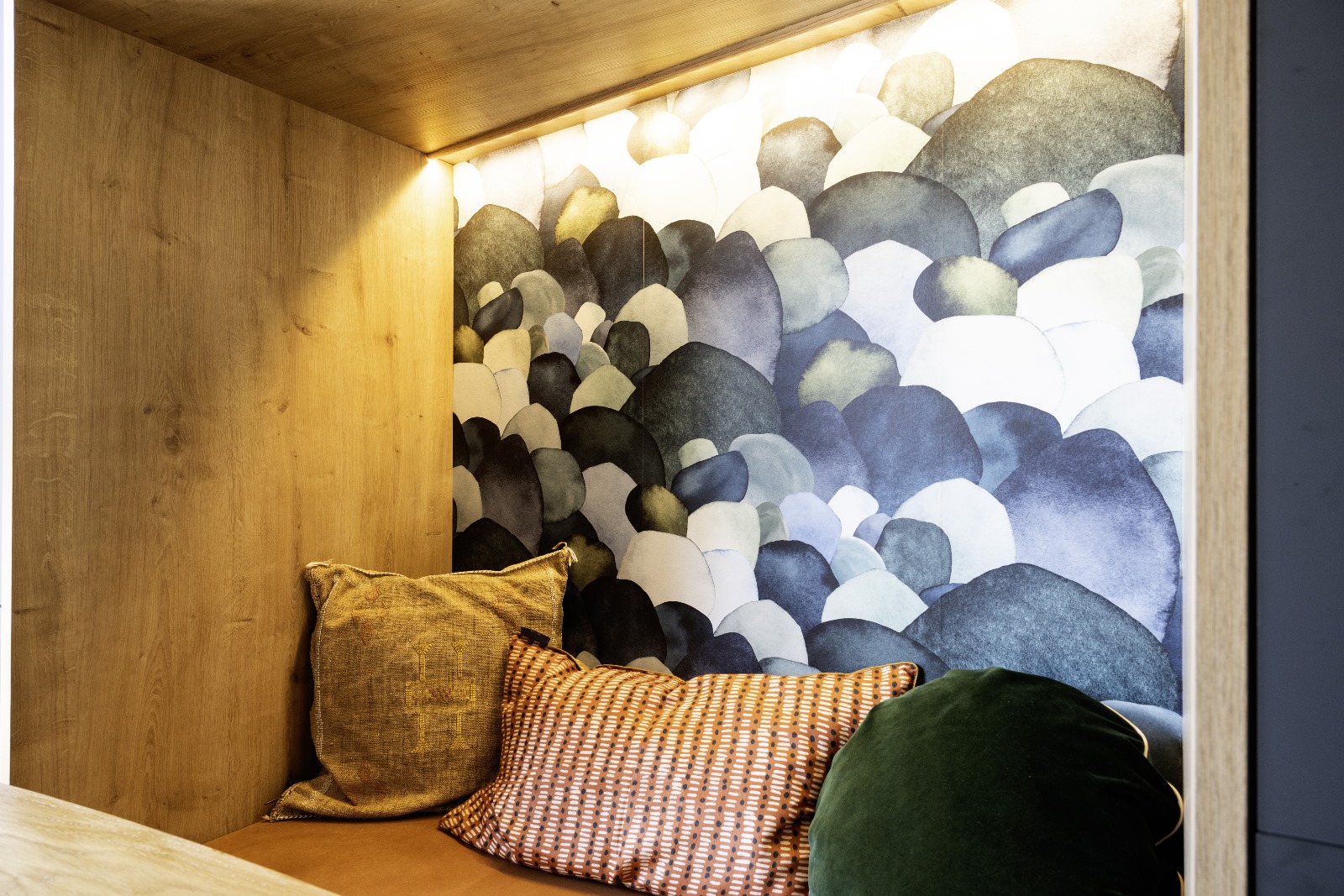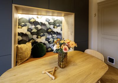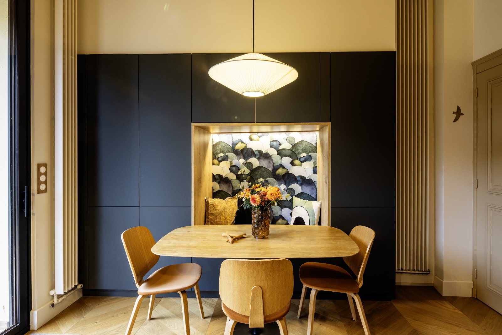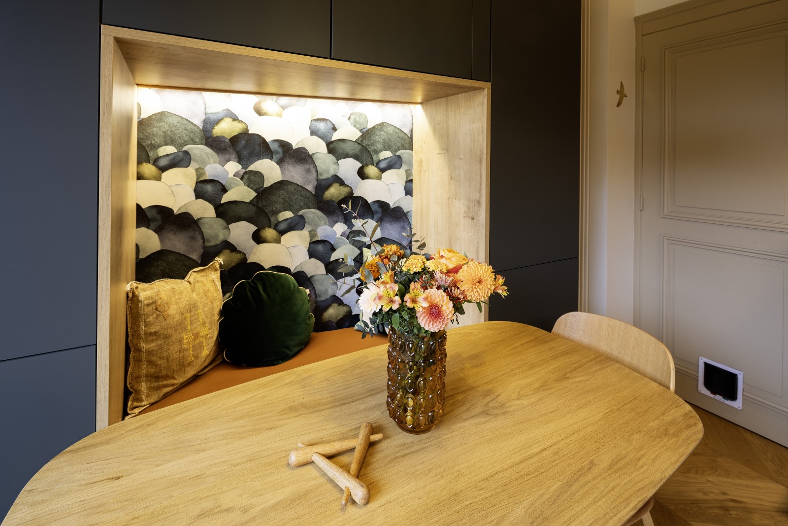 Le bois est omniprésent, on en retrouve sur le sol en chevron, dans les niches, sur le plateau de table, les chaises, ce qui apporte un max de chaleur pour un sentiment d’enveloppement.
