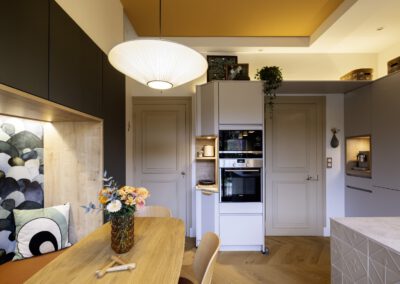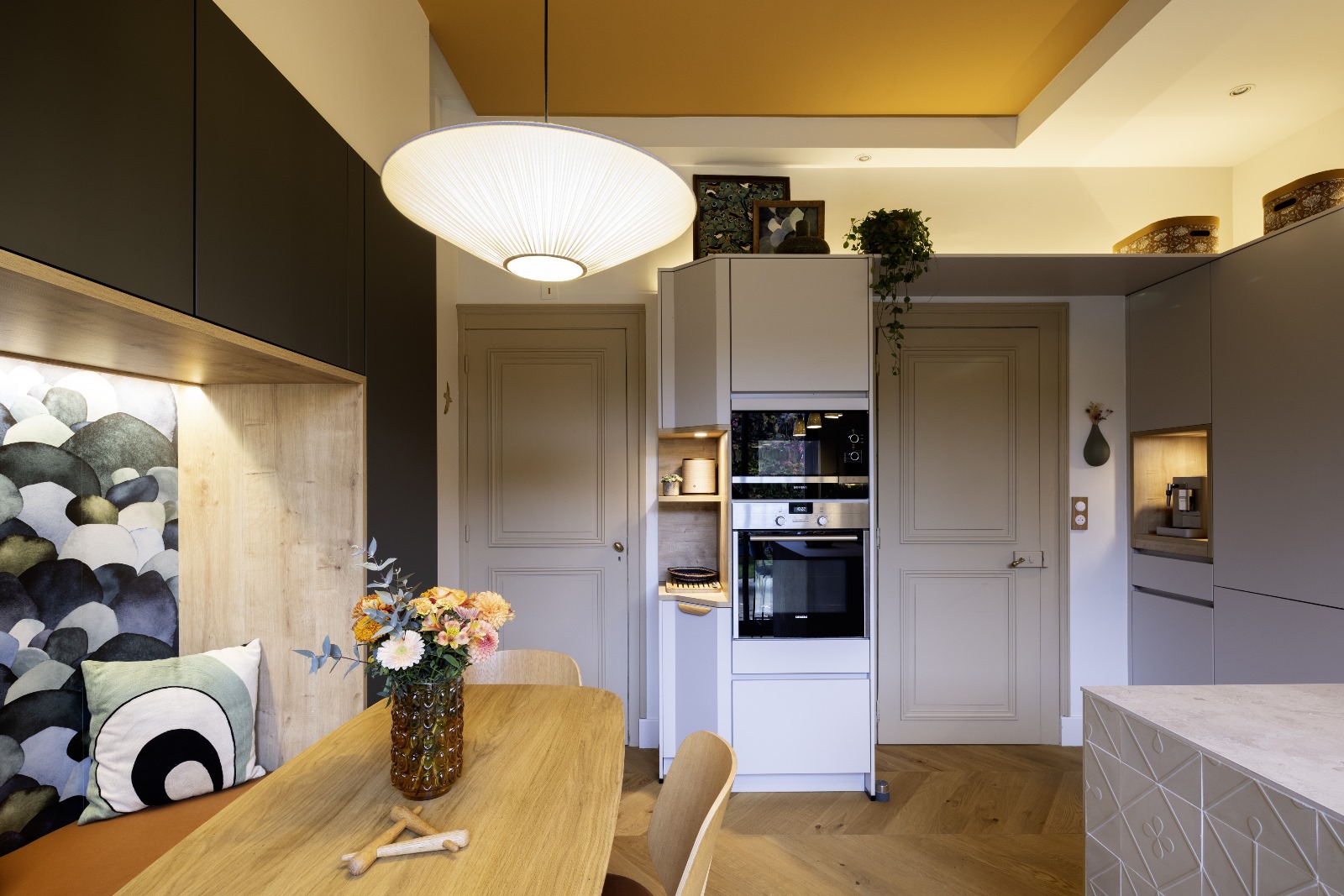 Ma mission pour ce projet: Gagner en place coté plan de travail et en espace rangement, ramener de la chaleur dans les matériaux, intégrer une petite banquette au projet.