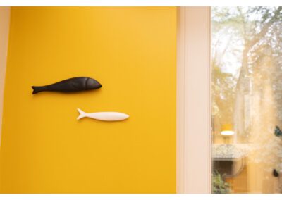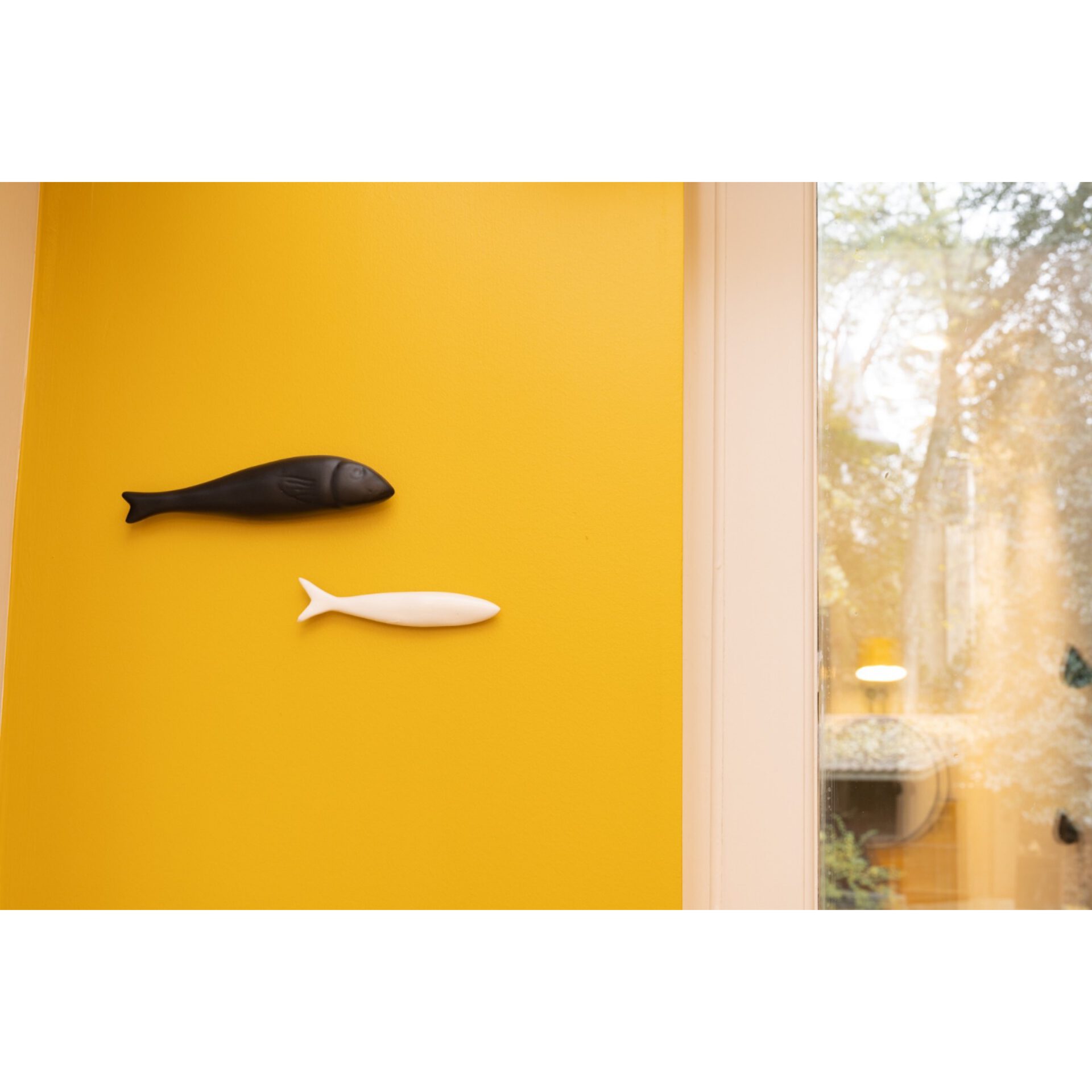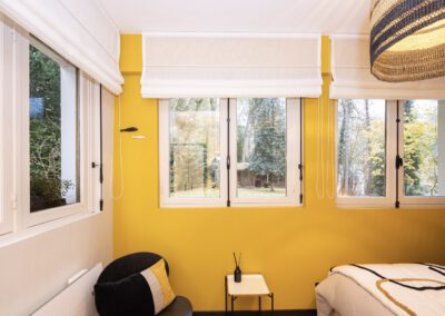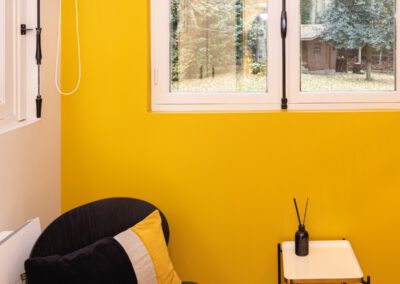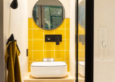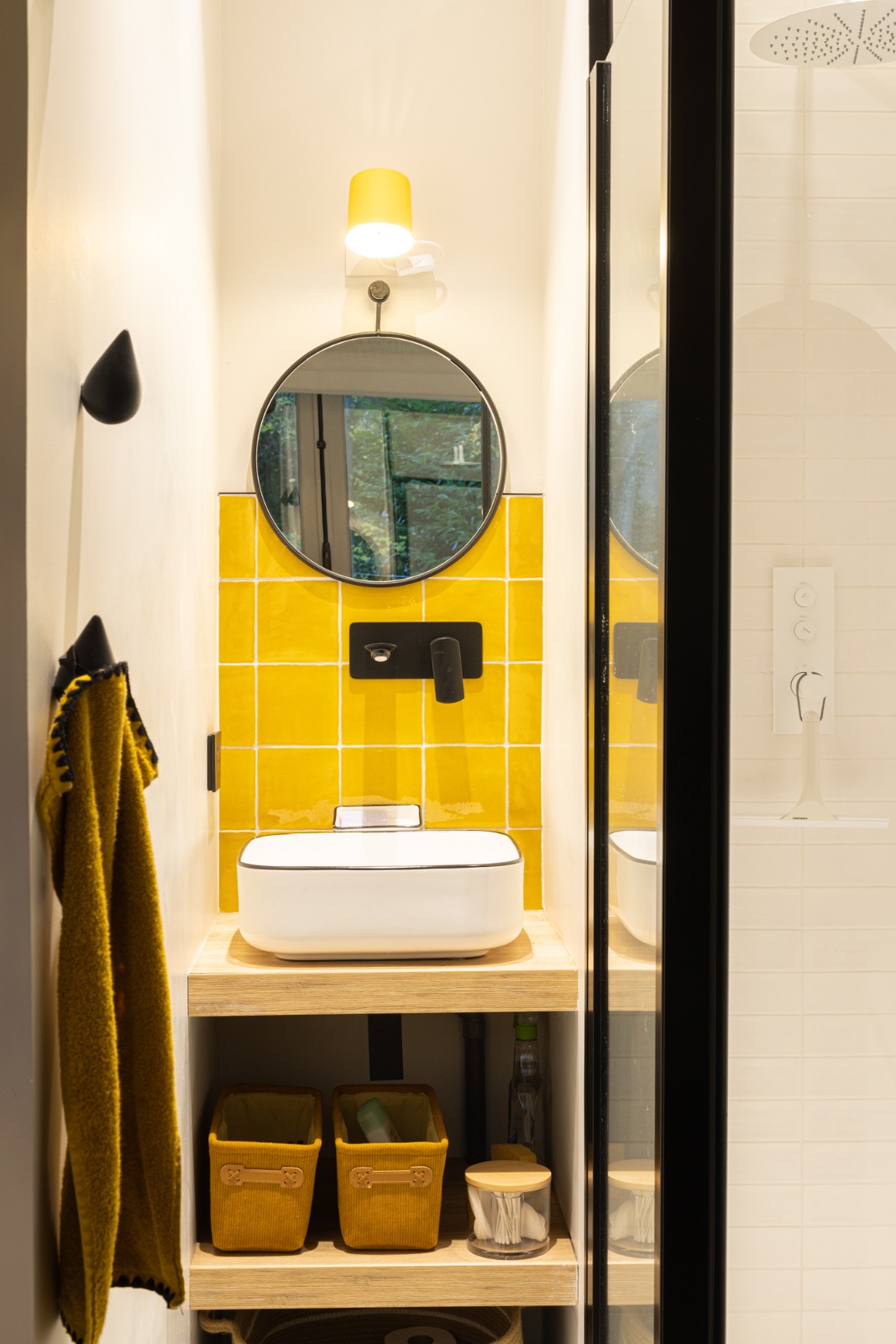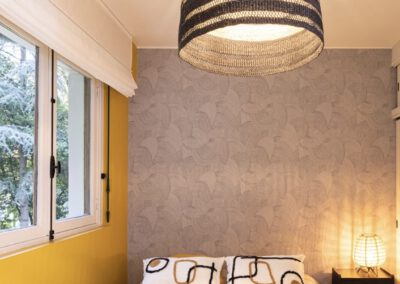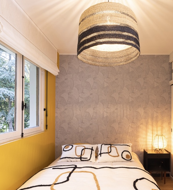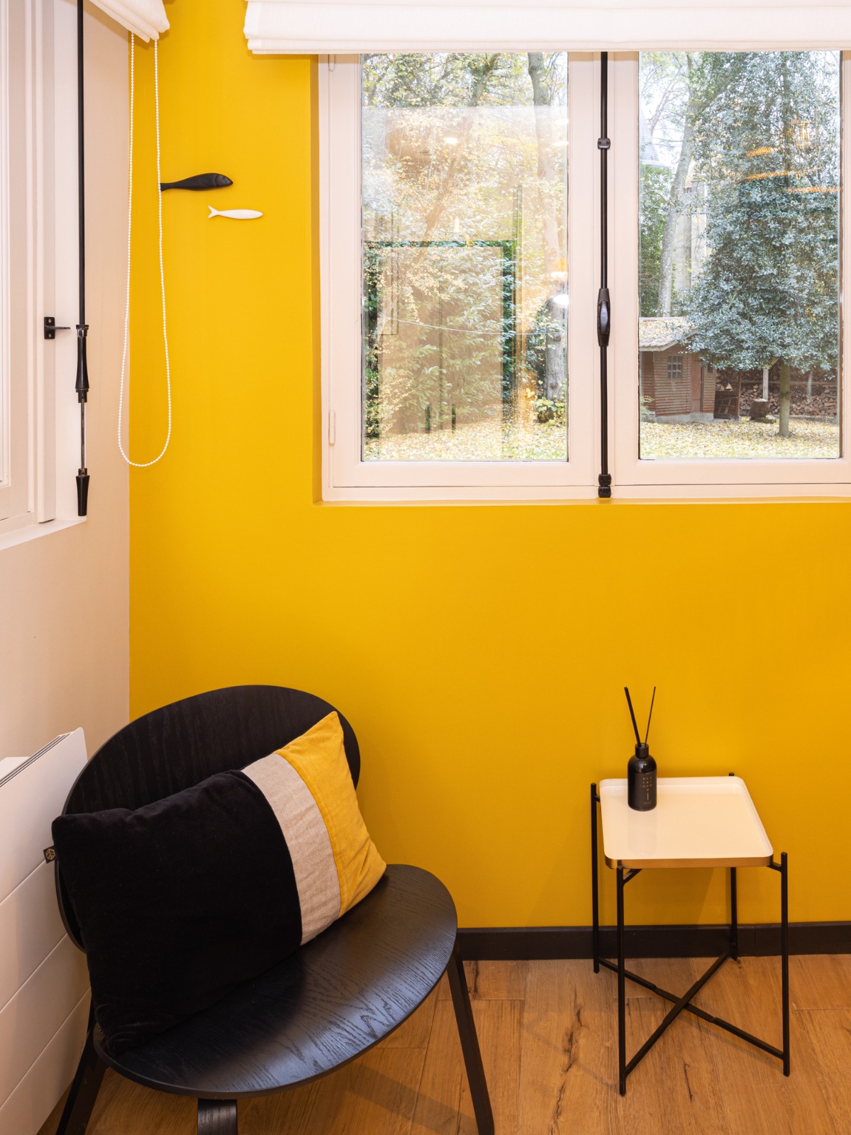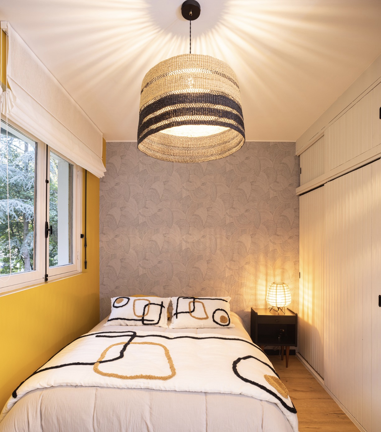 La chambre se trouvant au Nord, il était évident de proposer une teinte chaude en couleur principale, pour la réchauffer. Nous avons opté pour un jaune vivifiant. La touche de noir qui contrebalance le jaune s’est naturellement imposée, elle amène ce côté chic à la pièce. La déco noire, blanche et jaune s’est alors déclinée dans ce sens avec un joli papier peint et une suspension lumineuse aux allures ethniques, sans oublier le linge de lit coordonné dans les teintes.