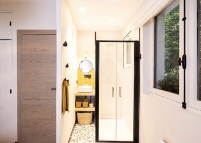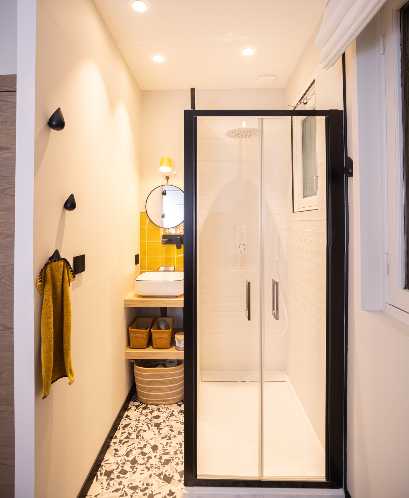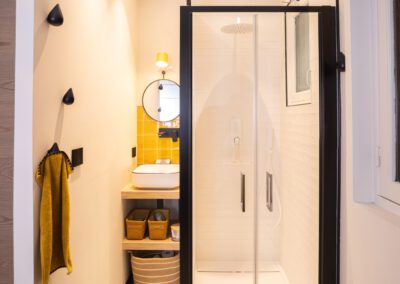 Une petite douche était existante dans cette pièce, nous sommes donc partis de cet espace pour agrandir la salle d’eau et y amener une douche plus aérée (en la plongeant dans le blanc, du sol au plafond) ainsi qu’un lavabo sur étagères pour favoriser le rangement.