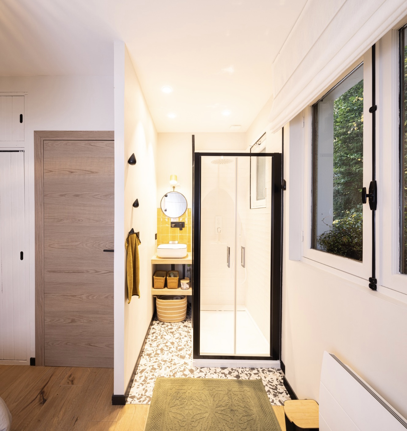 Le sol s’est habillé d’un joli parquet bois ainsi qu’un carrelage design aux motifs noir et blanc au niveau de l’espace douche.
