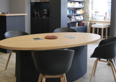 Ce salon de coiffure situé au centre de Reims n’avait pas bougé depuis 25 ans. Mon client désirait un salon chic, sobre, un poil masculin mais surtout un salon qui lui ressemble… Les beaux volumes et le cachet du lieu me permettaient de créer différents espaces tout en laissant une bonne circulation dans le salon!